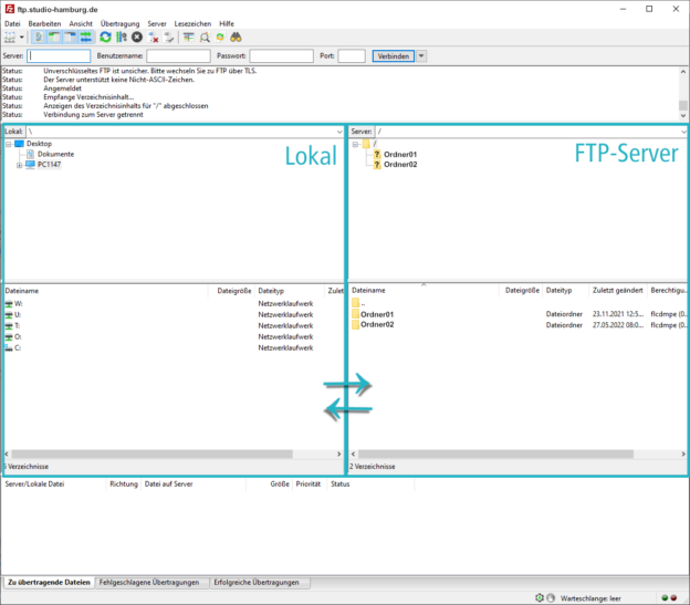- die linke Seite zeigt die lokale Ordnerstruktur, die rechte Seite zeigt die Ordnerstruktur des jeweiligen FTP-Servers